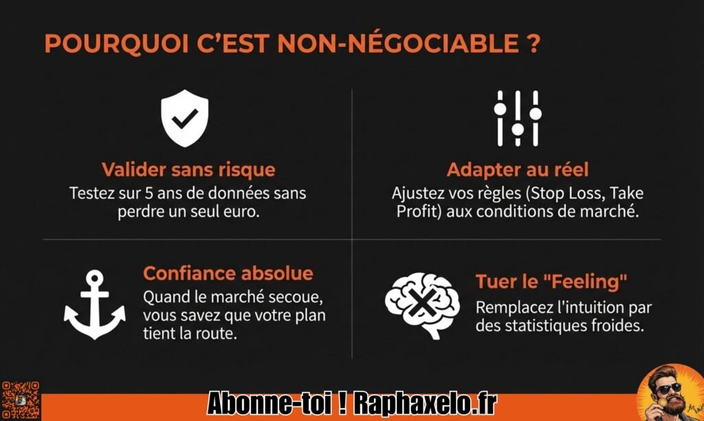 - 1. Valider votre idée sans risque : Vous pouvez tester votre stratégie sur des années de données avant de sortir un euro, ce qui limite les mauvaises surprises dues à un plan bancal.