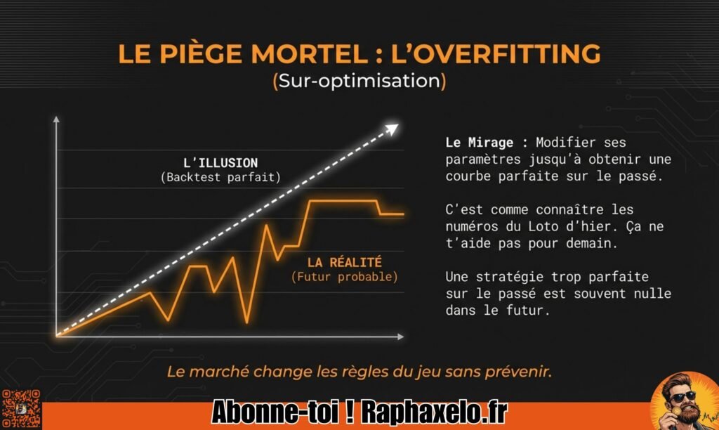 Si le backtesting est ultra-puissant, il serait naïf de croire que tout ce qui marche sur le passé vous rendra riche demain. Il existe des pièges subtils qui transforment les plus beaux graphes en déceptions bien réelles. Qui n’a jamais lu de disclaimer “le passé ne garantit pas les résultats futurs” ça marche également ici. Parmi eux, le surajustement (overfitting) est l’ennemi numéro un : votre stratégie peut être calibrée à la perfection… pour le passé, mais rater l’avenir.