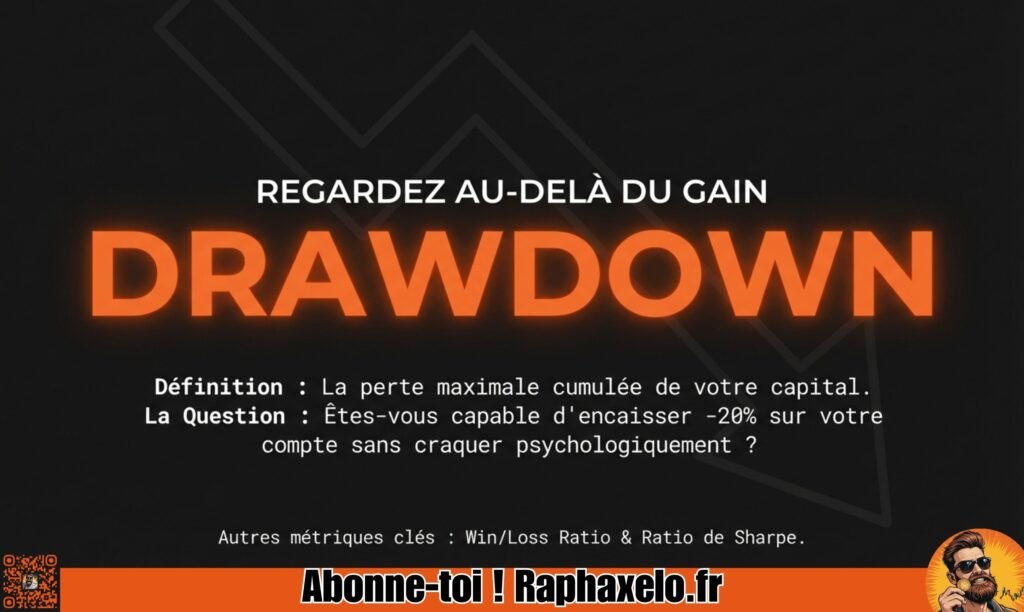 - Drawdown : Plus basse perte cumulée depuis un sommet. Attention si un drawdown dépasse 20-30 % : la stratégie risque de saborder votre moral (et votre capital) en réel.