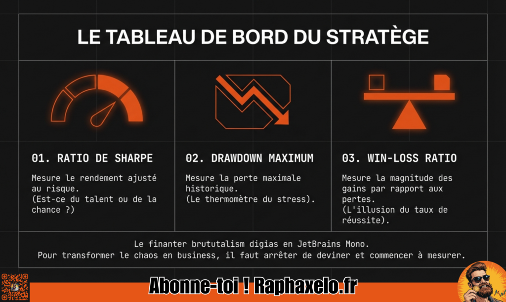 Ces indicateurs servent à évaluer la performance d’une stratégie de trading sous le prisme de la gestion des risques. Une stratégie qui affiche +50 % de rendement annuel mais qui a subi une chute de 40 % en cours de route n’est pas une stratégie robuste — c’est un pari à haut risque masqué par un résultat flatteur. Les indicateurs permettent de distinguer la chance (le facteur “Loto”) du talent (la reproductibilité statistique sur le long terme).