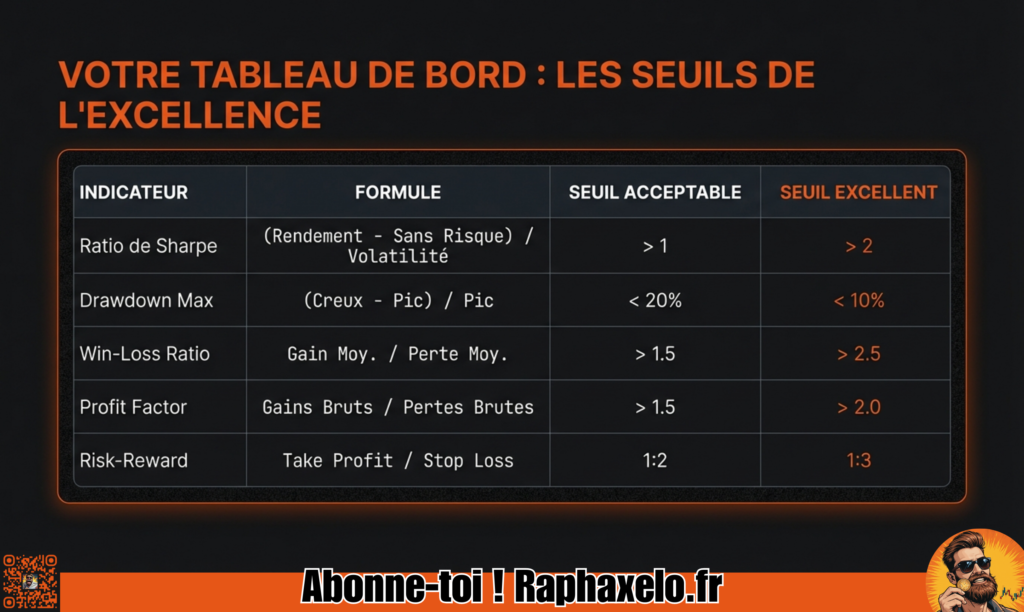 En maîtrisant le ratio de Sharpe, le drawdown maximum, le win-loss ratio, et leurs métriques complémentaires (profit factor, expectancy, risk-reward), vous quittez définitivement le monde des parieurs pour entrer dans celui des investisseurs sérieux. Le trading n’est pas une question de “feeling” ou d’intuition — c’est une question de données historiques, de discipline et de reproductibilité statistique.