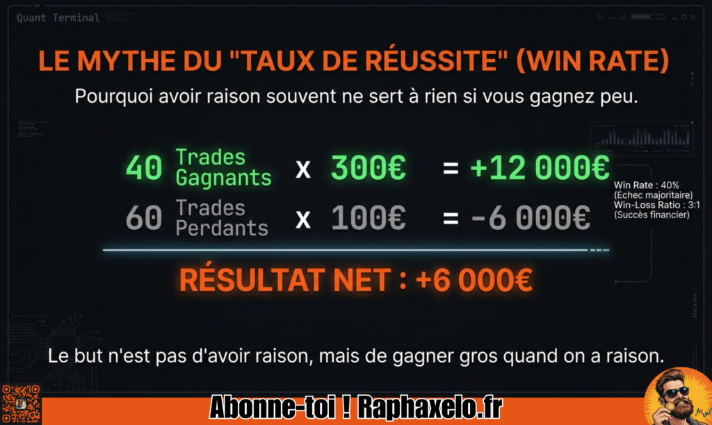 Win-Loss Ratio = Gain moyen par trade gagnant / Perte moyenne par trade perdantL’Exemple Concret qui Change Tout : Win Rate de 40 % et Rentabilité Positive