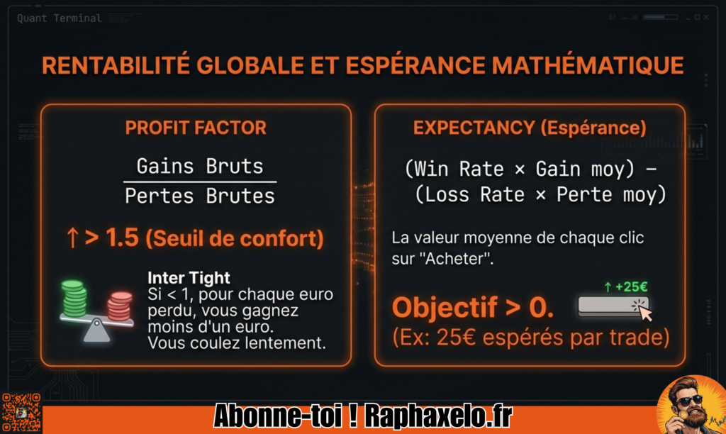 Profit factor et expectancy : la stratégie génère-t-elle de la valeur de manière consistante, ou quelques trades exceptionnels masquent-ils une machine à perdre sur la majorité des opérations ?