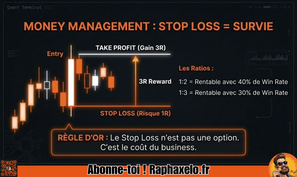 Risk-Reward Ratio = Distance jusqu’au Take Profit / Distance jusqu’au Stop LossSi vous risquez 10 € pour en gagner 20 €, votre ratio est de 1:2. Avec un ratio de 1:2 et un win rate de 40 %, votre stratégie est rentable. Avec un ratio de 1:3, elle l’est même avec un win rate de 30 %. C’est ici que le stop loss devient votre meilleur allié ou votre pire ennemi si vous le déplacez par peur. Le stop loss n’est pas une option — c’est une question de survie à long terme, comme je l’explique en détail dans l’article Risques Financiers en Trading : Stop Loss = Survie. Pour simuler des milliers de scénarios de risk-reward, découvrez également la méthode Monte Carlo appliquée au trading.