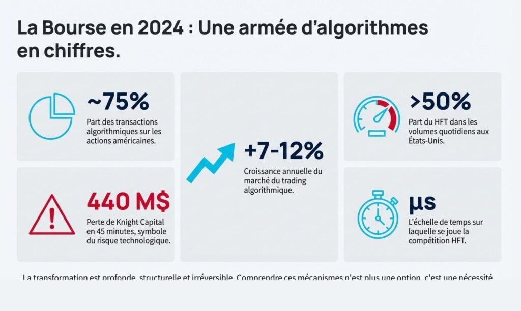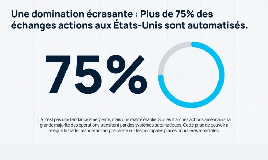 Un simple coup d’œil à une infographie, et tout devient limpide : près de 75% des transactions sur les marchés actions aux États-Unis transitent par des algorithmes ; le HFT capte à lui seul plus de 50% des volumes ; et la domination géographique est nette, avec l’Amérique du Nord et l’Europe sur le podium de l’adoption algorithmique.