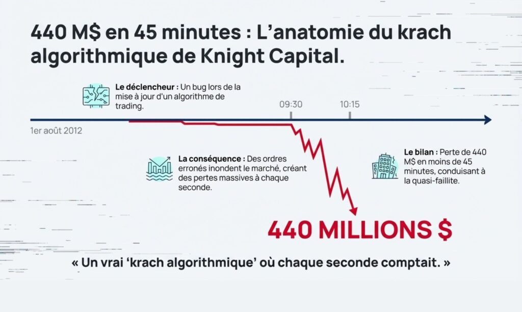 - L’incident Knight Capital (août 2012) : En moins de 45 minutes, un bug dans la mise à jour d’un algorithme a généré plus de 440 millions de dollars de pertes, plongeant la firme dans une crise fatale — un vrai “krach algorithmique” où chaque seconde comptait.