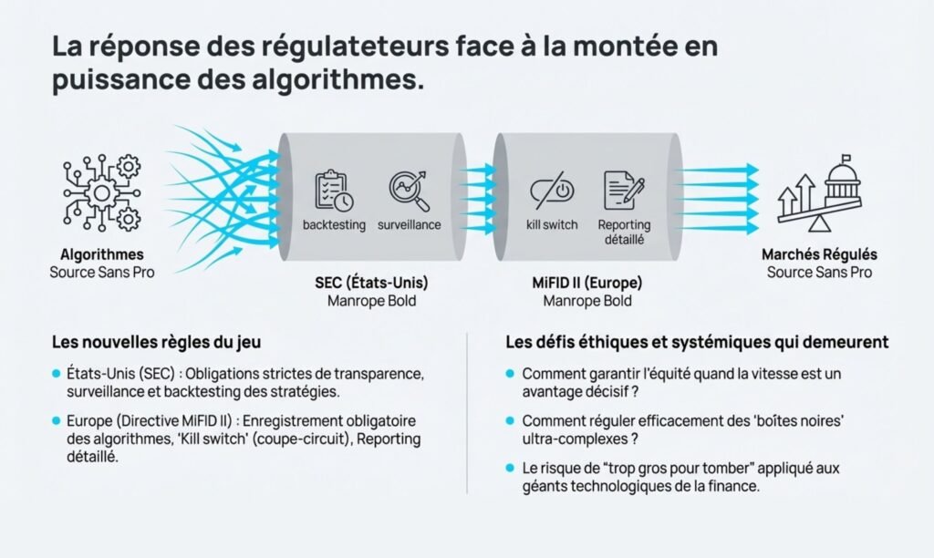 Face à la montée fulgurante des algorithmes, les régulateurs ont sorti la grosse artillerie. Aux États-Unis, la SEC impose des obligations strictes de transparence, de surveillance et de backtesting sur les opérateurs de trading algorithmique. En Europe, la directive MiFID II renforce l’encadrement : enregistrement des algos, ‘kill switch’ obligatoires, reporting détaillé des ordres — autant de stop-gap pour éviter les excès.
