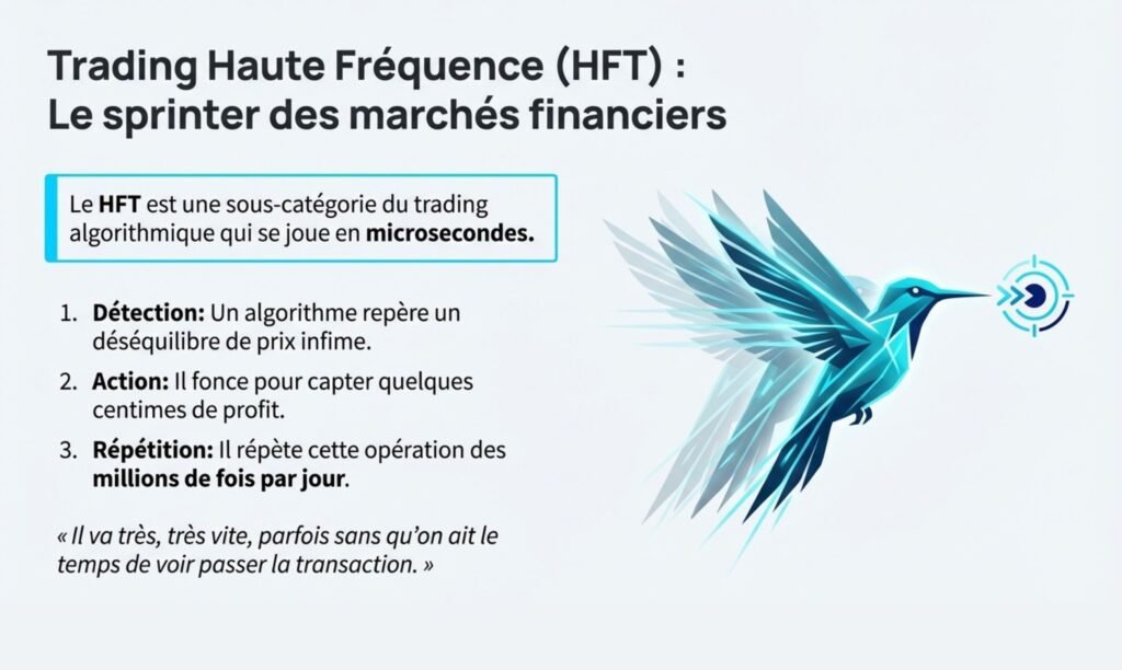 Le trading haute fréquence (HFT), c’est un peu le sprinter Usain Bolt du marché boursier : il va très, très vite, parfois sans qu’on ait le temps de voir passer la transaction. Tout se joue en microsecondes. Dès qu’un déséquilibre de prix se présente, le HFT fonce pour capter quelques centimes, mais répète cette opération des millions de fois par jour.